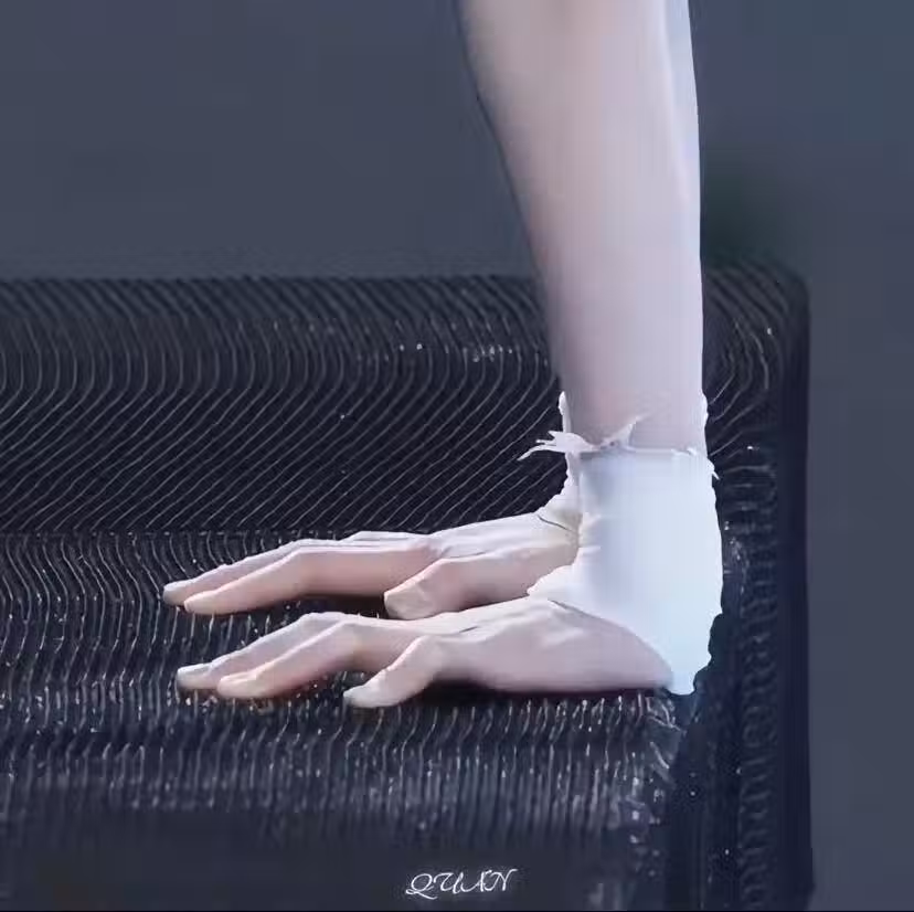 這是一雙纖細、修長且白皙的手,手腕上綁有白色的繃帶,手指彎曲牢牢扣住地面,手部肌肉線條清晰,顯得十分優雅且有力量感,柔美中帶著剛毅!