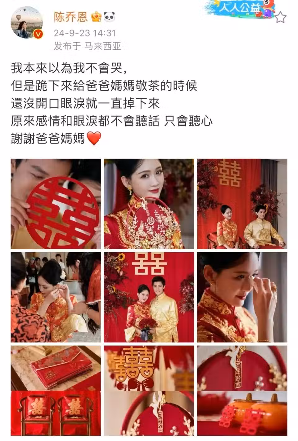 恭喜!陳喬恩曬中式婚服造型,和艾倫同框登對養眼,給父母敬茶哭成淚人