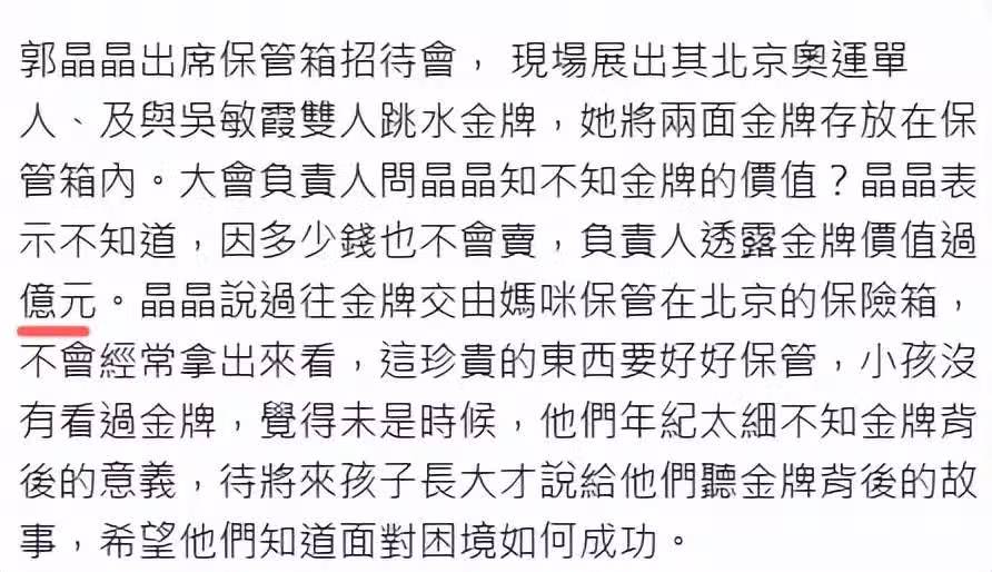 郭晶晶拿金牌拿到手軟,每一塊金牌都有特別的意義,郭晶晶曾在一次活動上自曝,她結婚後,金牌都放在家裡交由母親保管,只有遇到活動時才會免費提供給主辦方。