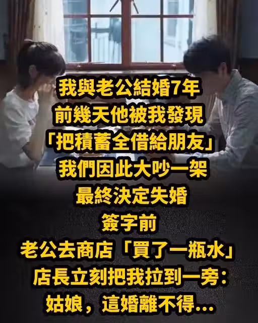 簽字前,老公去商店「買了一瓶水」,店長立刻把我拉到一旁:姑娘,這婚離不得...