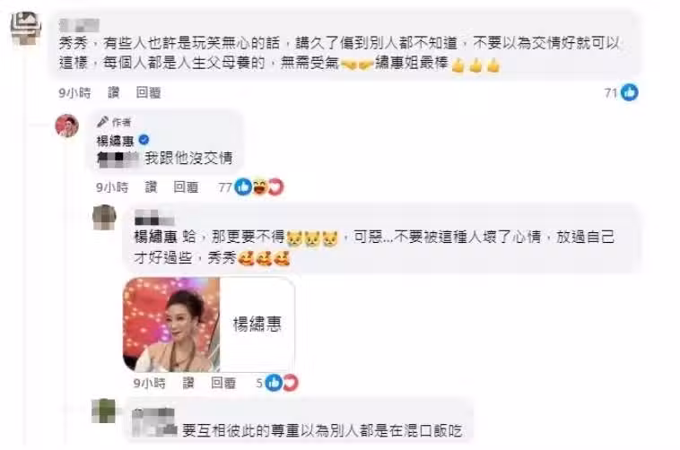 面對這場風波,徐乃麟則表示他已經傳簡訊給楊繡惠,解釋了事情的來龍去脈,並希望未來兩人還可以繼續合作。他強調自己不是節目通告的安排者,但依舊歡迎楊繡惠再度上節目,「我們是好朋友,還是會打招呼,節目上還是很歡迎她的到來」。