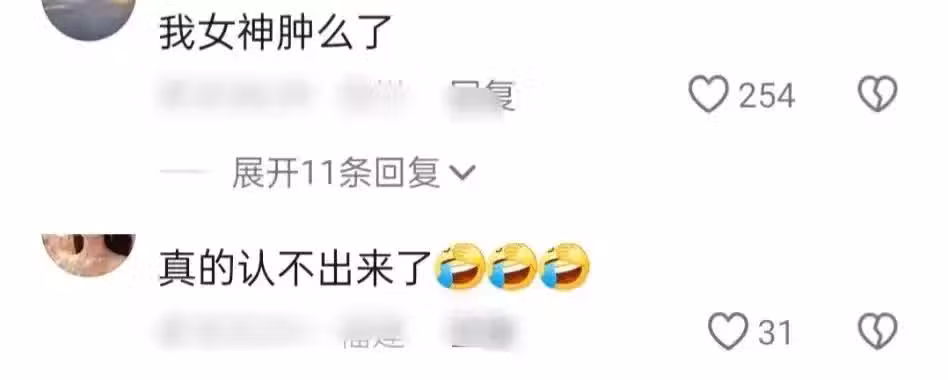 看到阿嬌的近照,評論區很多網友覺得難以置信,有人說沒認出來這是阿嬌,也有人認為阿嬌變腫了,肥胖對女神的氣質影響很大。