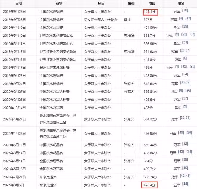 13歲的陳芋汐2018年9月23日參與全國跳水錦標賽,她的成績是421.1分奪冠,也比李蕊汐多了62.35分。