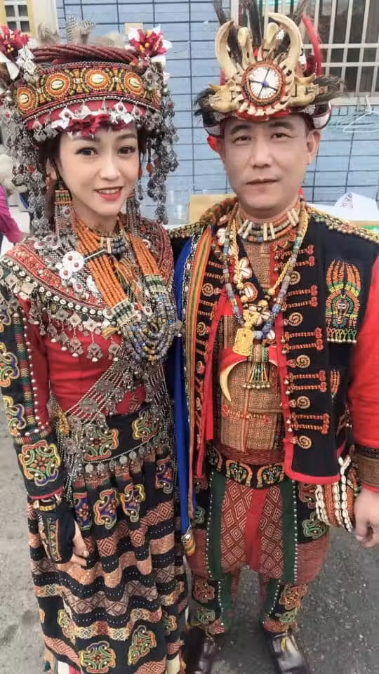 新郎身穿傳統的排灣族服飾,成套的背心、獠牙項鍊、貝殼包包,無不展示著這對新婚夫婦的華貴身份。