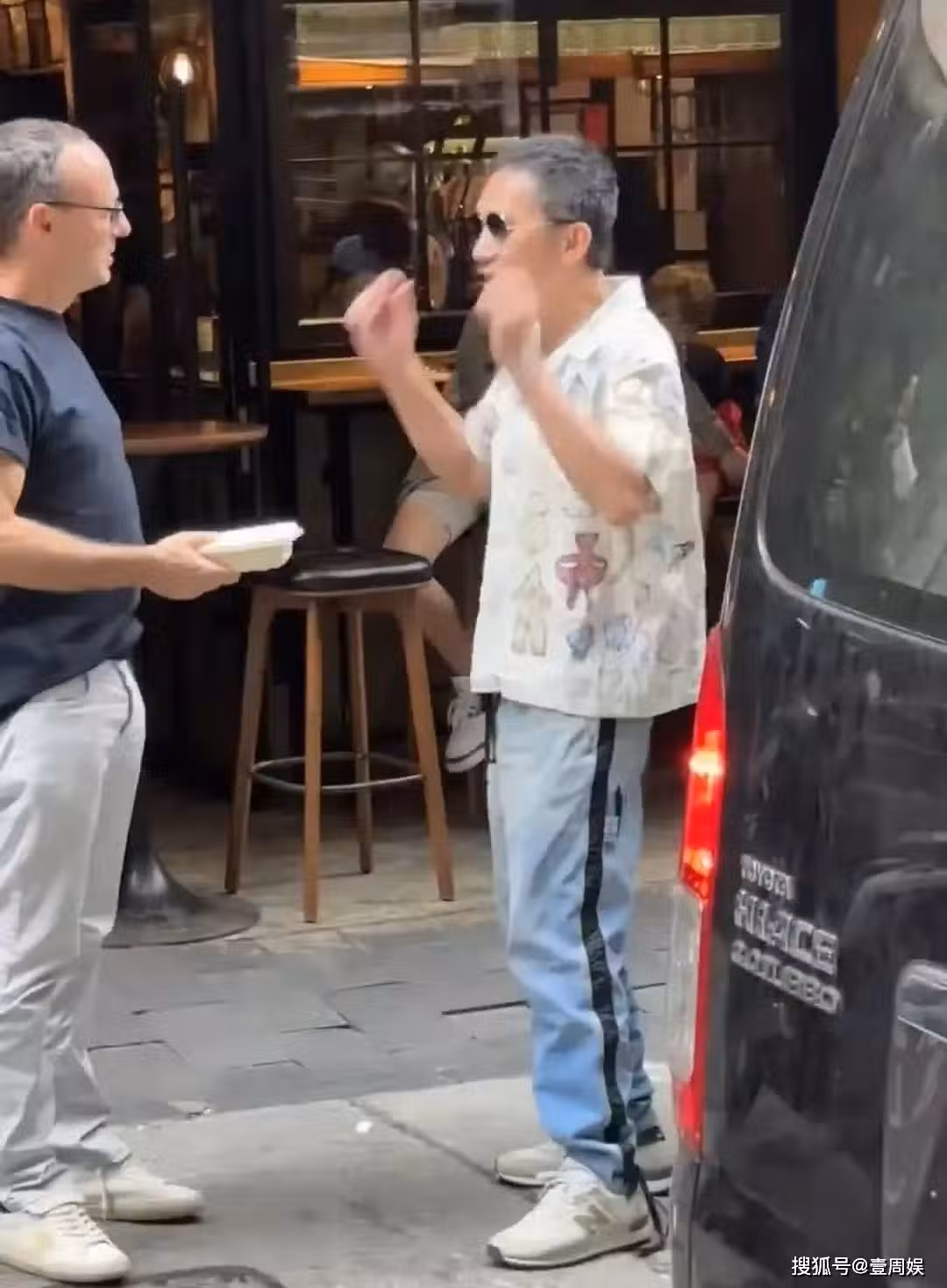 兩人正在餐廳的門口,梁朝偉的旁邊有一輛保姆車,看這個樣子,估計是出來買東西,所以才會被偶遇。不得不說,他還是挺接地氣的,身邊也沒有任何工作人員陪同,整個人看起來很隨和的樣子。