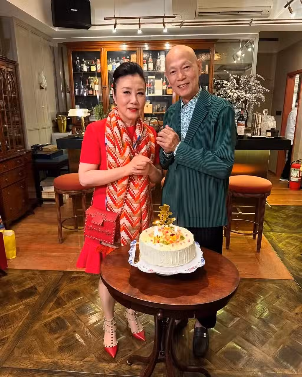 汪明荃慶祝羅家英78歲生日!全身紅打扮喜慶,穿鉚釘高跟鞋潮爆了