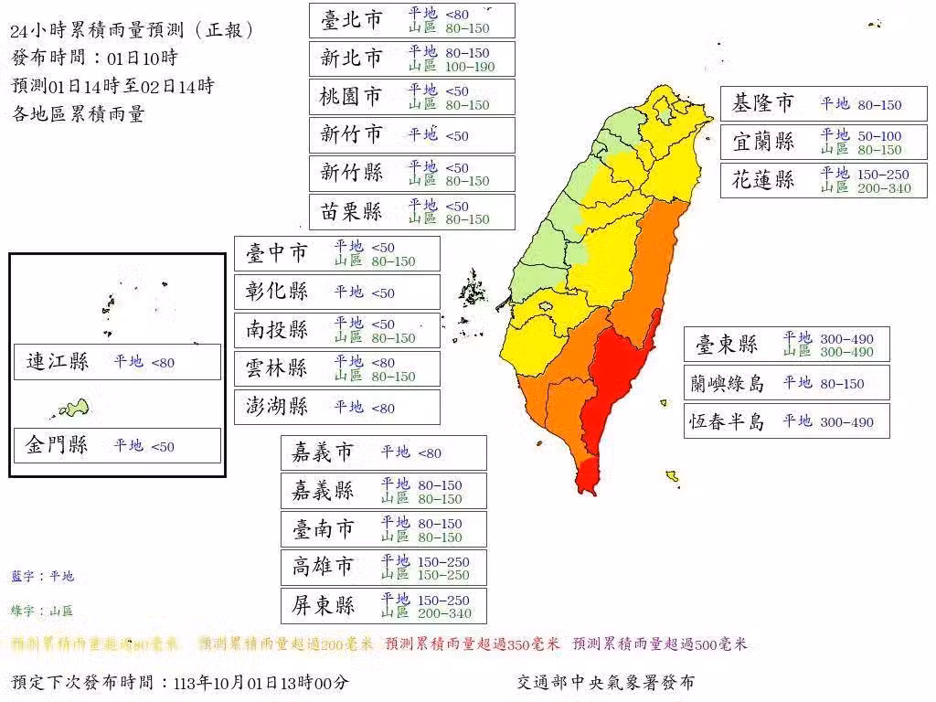 據行政院人事行政總處《天然災害停止上班及上課作業辦法》規定,依據氣象預報,颱風暴風半徑4小時內可能經過的地區,平均風力達7級以上或陣風達10級以上時,或未來24小時累積雨量預測達到山區200毫米、平地350毫米,得宣布停班停課。