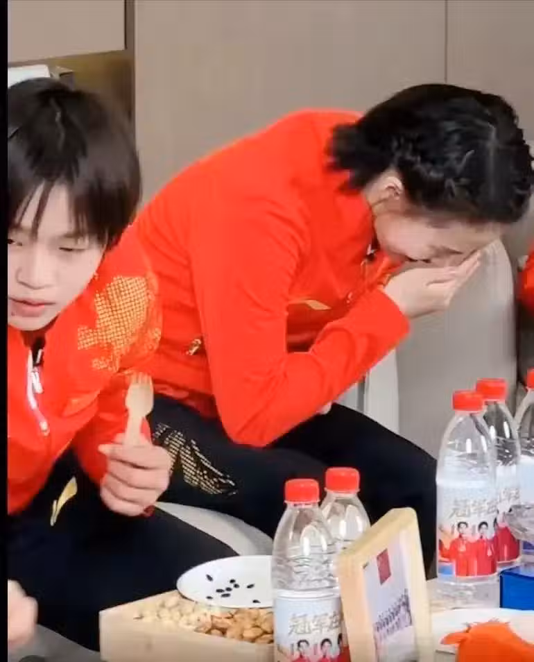 而離全紅嬋最近的陳芋汐,則是這場「大賽」的焦點。她與全紅嬋關係親密,看著好友吃得津津有味,心中既有喜悅也有無奈。幾次想要笑出聲,卻又硬生生憋了回去,臉漲得通紅,嘴角微微上揚,形成了一幅幅生動的表情包。最終,她還是沒能忍住,低頭捂嘴,笑聲從指縫間溜出,感染了整個直播間。