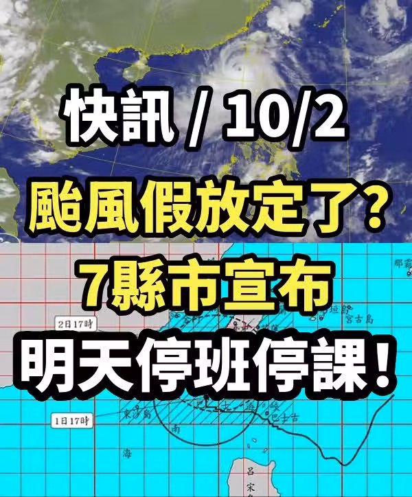 快訊/10/2颱風假放定了?7縣市宣布「明天停班停課」!