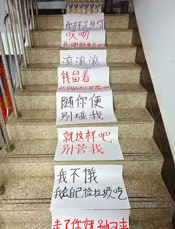 上面寫著許多女生生氣時說的經典語句:「滾滾滾」、「錢留著給別的女人買花吧」、「隨你便,別碰我」、「就這樣吧,別管我」、「我不餓,我會自己撿垃圾吃」,樓梯最上方還掛著大大的紅布條:「歡迎陰晴不定李女士回家!」