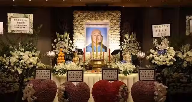 今日,李海生的兒子拿著父親的彩色遺照,步出靈堂。只見他穿著白色喪禮服,滿臉哀傷。