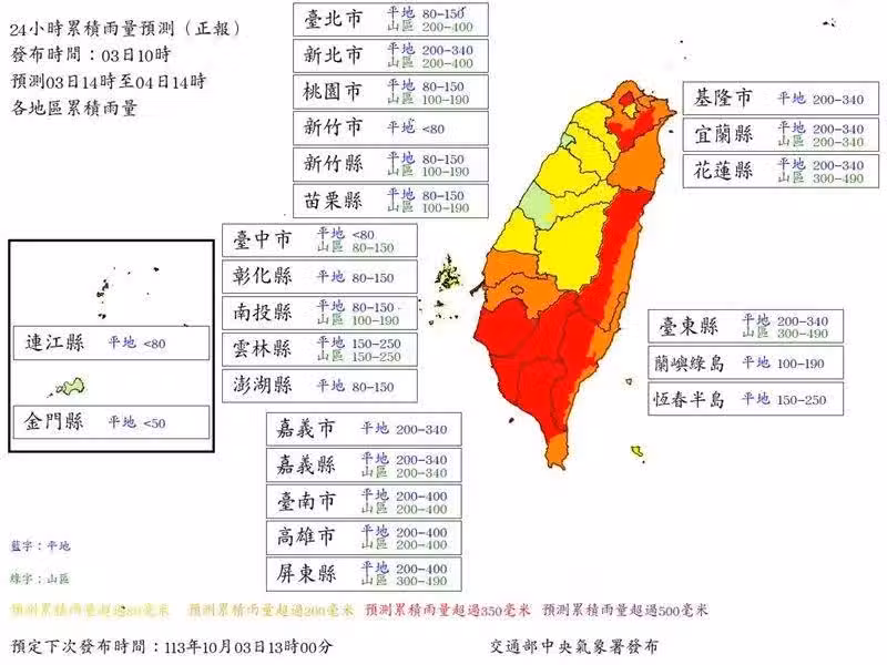 根據中央氣象署今(3)日10:00發表之最新風雨預測狀況,明(4)日0時至6時,風力預測部分,連江、澎湖2縣市達停班課標準;雨量部分,台北市山區、新北市山區、高雄市山區平地等9縣市達停班課標準。共計11縣市達停班課標準,不過是否停班課,仍要視各縣市政府而定。