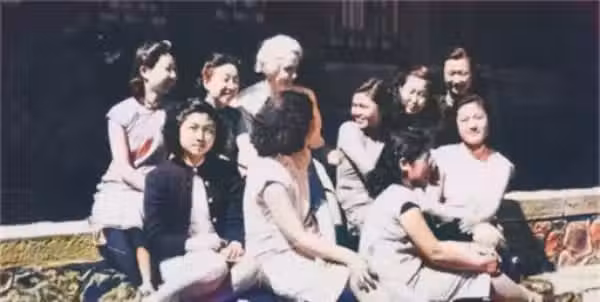 圖中幾個女子著裝整齊,一看就是有錢人家的小姐,打扮十分得體。