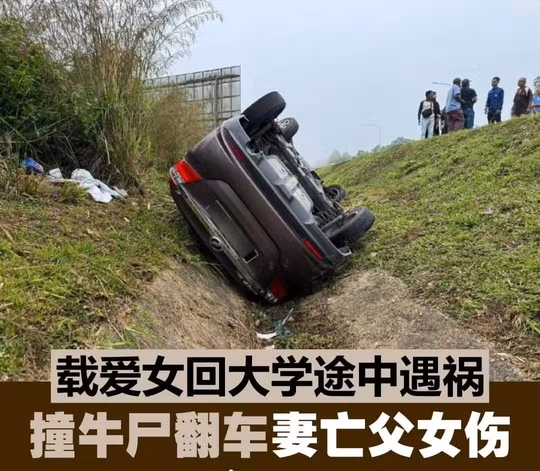 (瓜拉吉賴4日訊)一名家庭主婦與丈夫和女兒今日同乘轎車出行,不料卻因閃躲路面牛屍而失控翻車墜溝,最終釀成妻亡,父母倆人傷的悲劇!