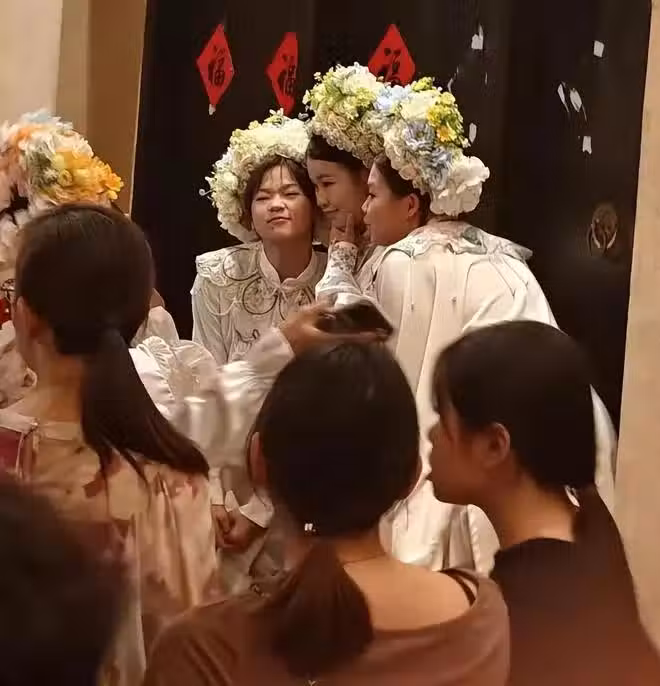 全紅嬋難得與姐妹一起合影,三姐妹全紅月全紅嬋全紅桃臉靠在一起擠表情,特別溫馨畫面,姐妹仨感情特別好。