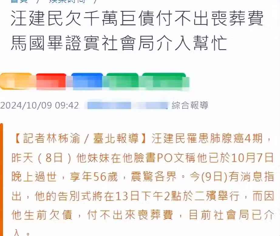 10月9日,台媒爆料汪建民因為欠債,沒有存款去處理他的喪事,最終尋求當地社會局介入幫忙,社會局或以「低收入戶」為汪建民處理喪事及遺體。