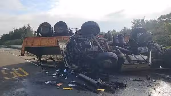 從現場畫面可以看到,西濱快速道路的某一段護欄已經被撞爛,而地上除了砂石車的殘骸、砂石泥土等散落一地,砂石車受損也很嚴重,場面怵目驚心。
