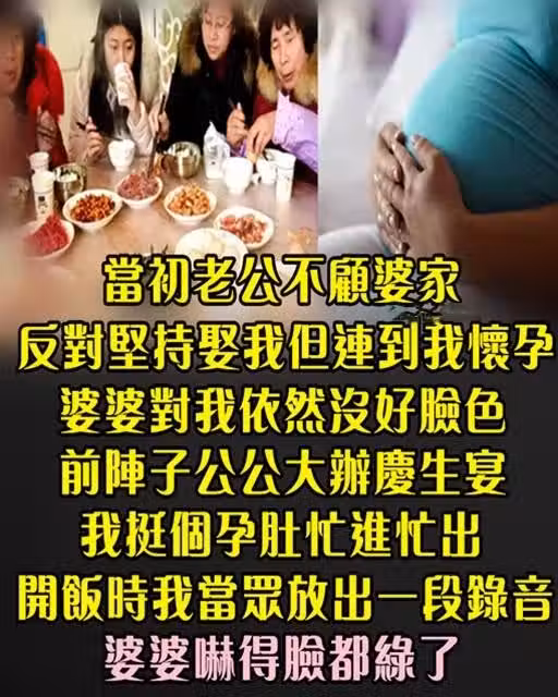 當初老公不顧婆家 反對堅持娶我! 但連到我懷孕 婆婆對我依然沒好臉色...前陣子公公大辦慶生宴 我挺九個月孕肚忙進忙出 開飯時我 「當眾放出一段錄音」 婆婆臉綠了