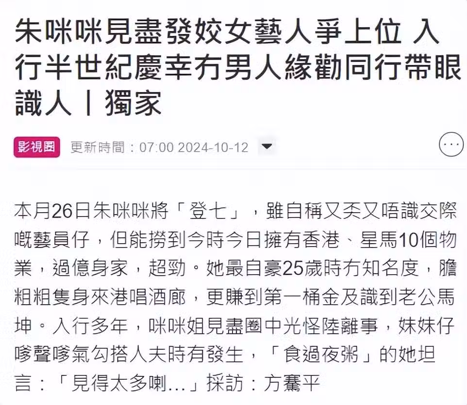 10月12日,朱咪咪接受港媒採訪內容曝光,她大方承認自己身家過億,在中國香港和馬來西亞、新加坡持有10個物業,下半輩子幾乎不用愁。