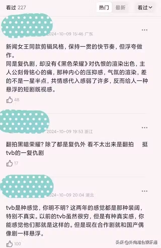 總而言之,《黑色月光》是一部優、缺點都很明顯的劇集,如果你恰逢劇荒,想看演技全員在線的復仇爽劇,想看楊怡「升級打怪」,又對港劇有一定情懷,那它大機率適合你;反之,則可能不適合你。觀劇之前,請自行斟酌。
