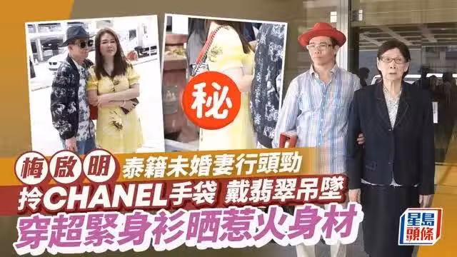 梅啟明的泰籍未婚妻當天濃妝艷抹,身穿Deep V領黃色連衣裙,大秀豐滿上圍,但最吸引眼球的還是她佩戴的巨型觀音翡翠吊墜。