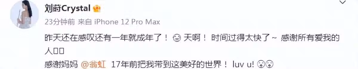 10月12日一早,知名星二代Crystal小水晶(翁虹之女)在社交網更新一組六宮格靚照,並附文寫道:「昨天還在感嘆,還有一年就成年了;天啊,時間過得也太快了,感謝所有愛我的人,更感謝媽媽在17年前把我帶到這個美好的世界,Love You(愛你)」!
