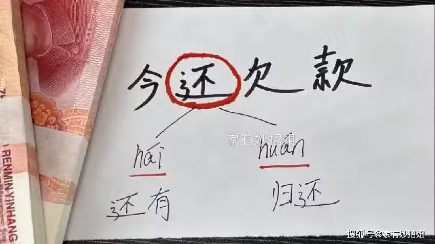 就比如我們在書寫借條時經常會使用到的生字:「還」,它是個多音字,可以讀huán,也可以讀作hái。