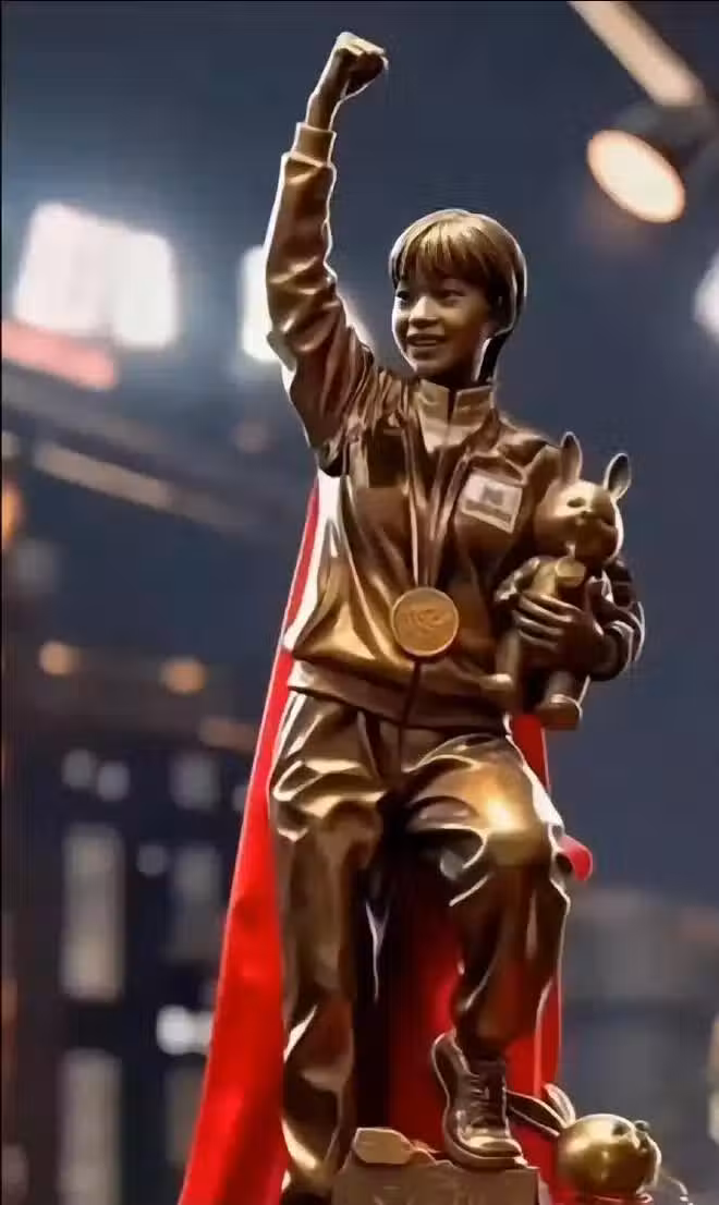 這一座銅像,似乎比前面兩座都要逼真,尤其是戴著金牌抱著吉祥物的全紅嬋,笑起來模樣特別可愛,簡直就是真人版的全紅嬋。