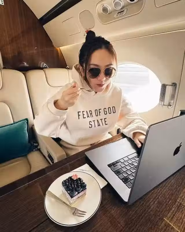 鄧紫棋昨日在社交平台上發文,她寫道:「My mobile office today」。照片可見,戴上太陽眼鏡、身穿白色衛衣的鄧紫棋,坐在一架奢華的私人飛機內,她一邊吃蛋糕一邊對著電腦工作,桌上還放了一杯檸檬水,看起來非常享受。
