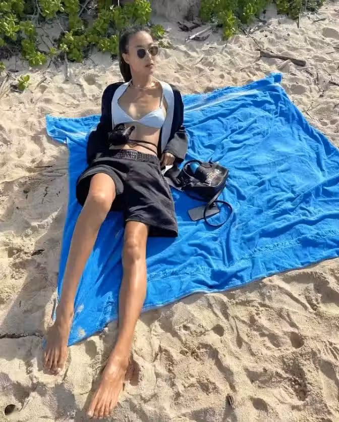 陳冠希近日在社交媒體網曬出愛妻與女兒在沙灘曬太陽的泳裝照片,本身是名模的秦舒培四肢纖瘦,更有川字腹肌。