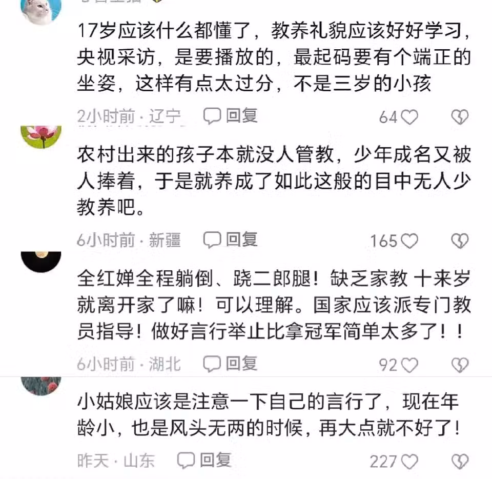 部分網友認為,全紅嬋應該注意自己的儀態,要落落大方,要多規範自己的言行舉止,不要過於舒展。