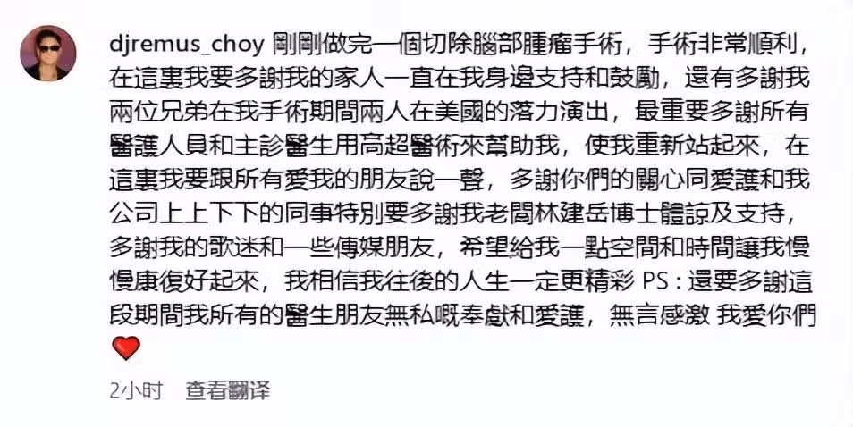 港星蔡一傑罹患腦瘤,做開顱手術後腦驚現近40厘米,成功後發文報平安