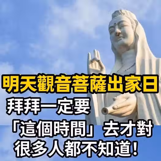 民俗專家廖大乙分享,農曆9月19日(2024年10月21日)的出家日是觀世音菩薩放下世俗、出家渡眾的日子,所以正能量強大,很適合在這一天轉換氣場及運勢,想轉運的朋友可以把握白天,將雙手合十向著天空懺悔,並立志要重新出發,尤其今年犯太歲的朋友,心誠祈願就能否極泰來!另外,要是想祈求好姻緣,出家日這一天也是很不錯的日子,單身的朋友們可要記住囉! 觀音生適合拜觀音的時間點,最佳感應時機為早上9點~中午11點。
