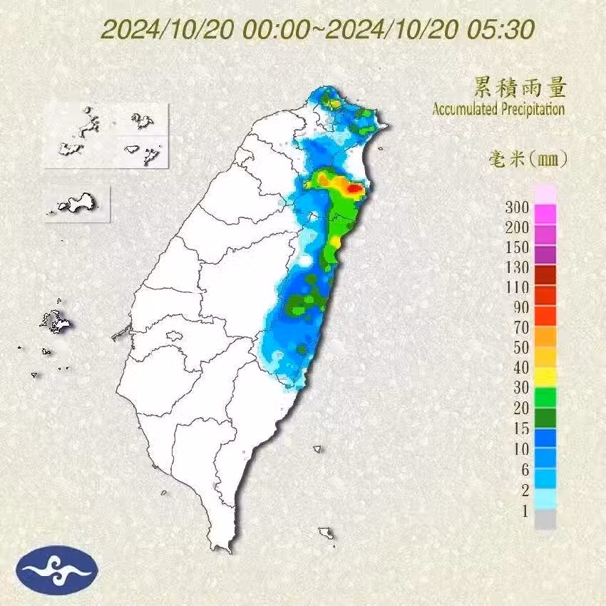 今晨0時至5時半間,累積雨量較高的區域主要集中在迎風面的基隆北海岸、東北部、東部以及大台北地區,降雨範圍較廣且明顯,可能出現短時間的強降雨或局部豪雨。