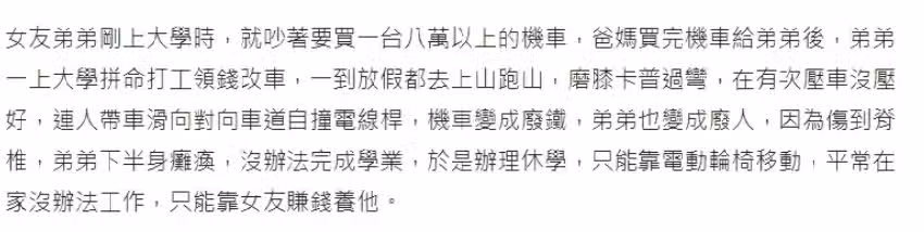 網友說,這件事情是兩人交往後,自己才知道的,除此之外,女友的家境不是太好,加上爸爸肝癌過世,剩下媽媽打零工、弟弟不能工作,全家的經濟重擔都在女友的身上。