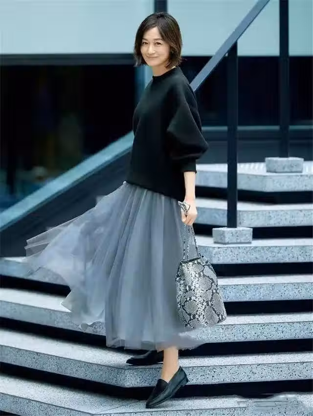 熱情的紅色總是能吸引人們的目光,完全沒有年齡的限制,中年女性選擇紅色的裝扮,不僅可以起到減齡的作用,也能擁有美好的心情。紅色與黑色是最經典的搭配方式,時尚又高級。富岡佳子的這件西瓜紅毛衣,落肩袖的設計加上寬鬆的版型,慵懶的女人味非常養眼。下身搭配一條黑色的緊身褲,形成上寬下窄的搭配形式,顯瘦的效果輕鬆就能完成。