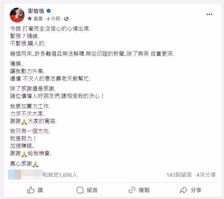 ▲澎恰恰奪金鐘吐償債心聲。(圖/翻攝自臉書)