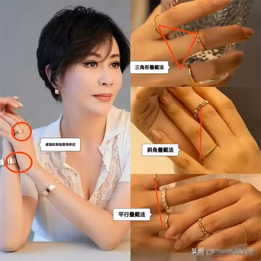 如果戒指本身的設計較為個性或小巧,將戒指佩戴在不同的手指上,位置上形成三角形、斜角或平行 ,也是讓人眼前一亮的搭配方式哦~