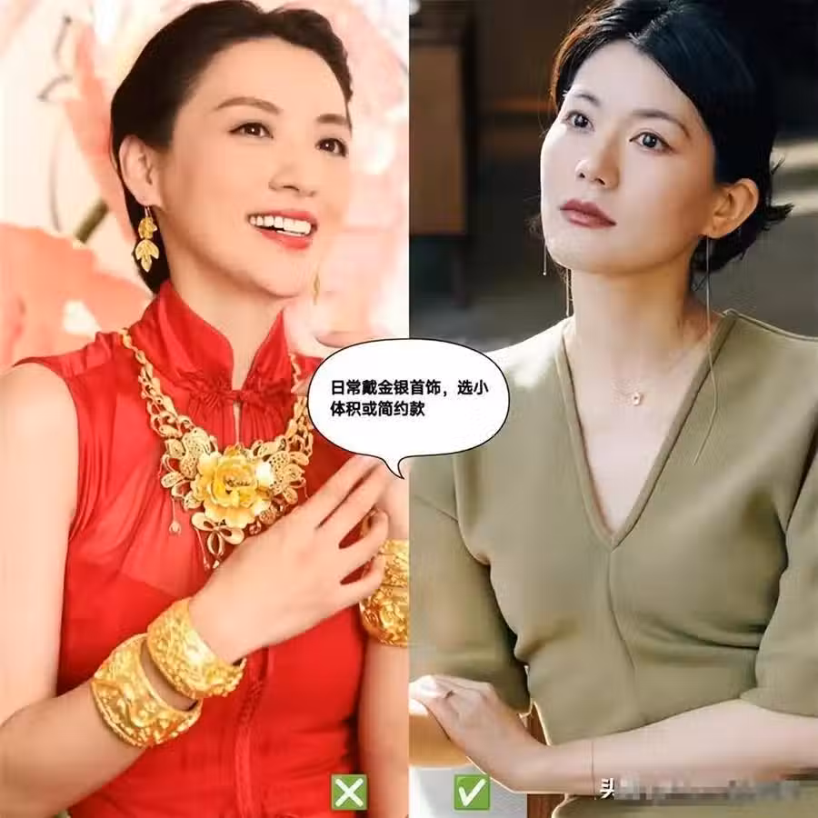 中年女人佩戴黃金飾品,差的不是錢,而是品位。要想不被說成是穿金戴銀的暴發戶,就得將重點放在款式的挑選上。