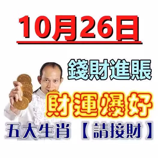 屬馬的朋友本來已經命中藏富貴, 聚八面財源 ,總會一天富貴臨門, 大富大貴。 今天10月26日生肖馬迎財接福好運兆 。 而且事業必定進入一個新的哩程碑。 從今天開始,生肖馬需準備好再衝刺,為新的月份大好基礎,且因常久以來的努力,開始逐漸達到人生的巔峰。 另外財運方面也很旺,由其偏財方面,財運可能會接二連三而來,錢財進帳,生肖馬的朋友進入10月尾端後偏財會更相當旺盛,獨占鰲頭。