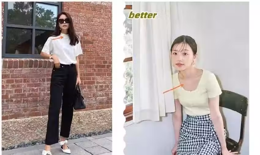 很多人穿T恤之所以顯壯,很大一部分的原因是因為緊湊的領口造成的,緊湊的領口對於脖子短或者臉肉、臉寬的妹子特別不友好,記住除了臉型問題,如果你上半身比較胖和壯,最好也是選擇露膚領口哦。