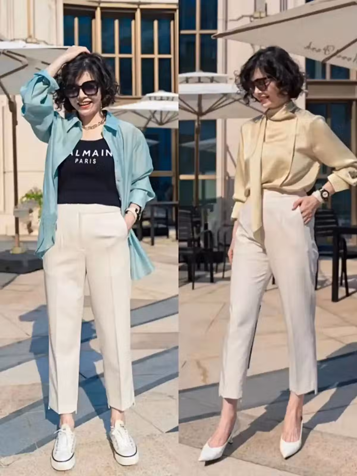 優雅總是與簡約利落不可分割,像白色九分煙管西褲就是提升高級感的首選,修飾腿部線條,還能烘托乾淨優雅的氛圍感。