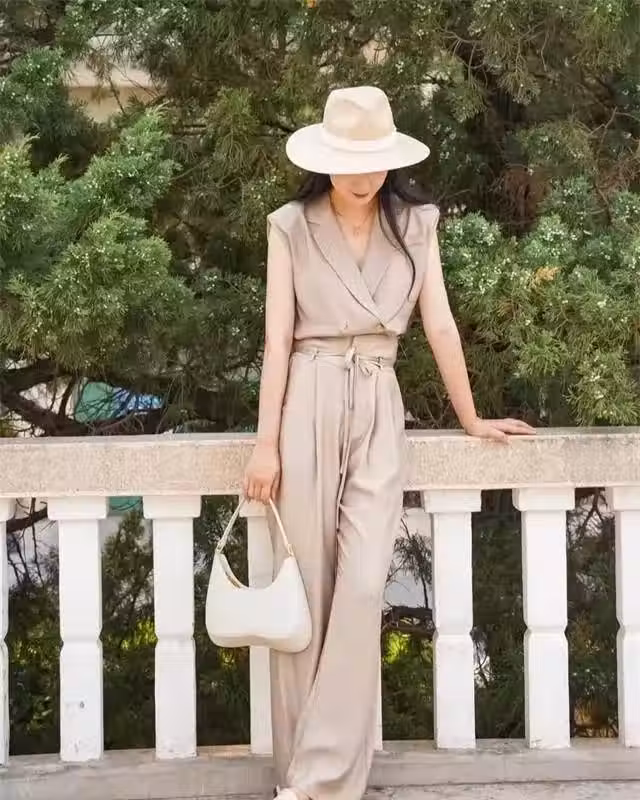西裝無袖上衣配上同色系闊腿褲,高腰線直接穿出大長腿。配上尖頭平底鞋,氣質乾淨幹練。用和平底鞋相呼應的手提包點綴,咱們的中年,只是時尚的開始呢~