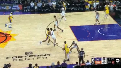 藉助濃眉掩護,里夫斯有效擺脫比爾。突破過程中里夫斯沒有選擇攻籃下而是罰球線完成拋投。