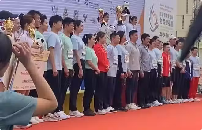 昔日的跳水皇后郭晶晶,穿著湖藍色的活動制服,外搭一件黑色運動衣亮相,她狀態鬆弛,完全沒有公眾人物的架子,細看樓頭鏡頭裡的郭晶晶,頭髮隨意得披著,臉上沒有半點妝容的修飾。