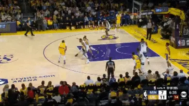 不否認戈貝爾強悍的護筐能力,但受限於移動速度不能及時換防出禁區。這個回合就是很好體現——當濃眉出手時戈貝爾只是象徵性的伸出雙臂。