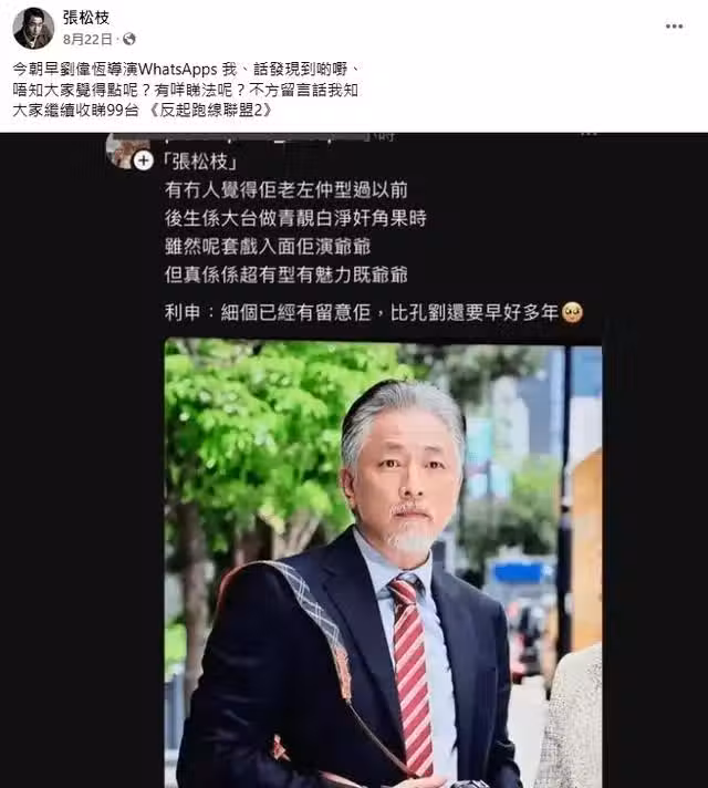 截圖上網民大讚張松枝:「有沒有人覺得他老了還型過以前年輕時在大台做青靚白凈反派那時,雖然這部戲裡面他演爺爺,但真是超有型有魅力的爺爺。利申:小時候已經有留意他,比孔劉還要早好多年。」