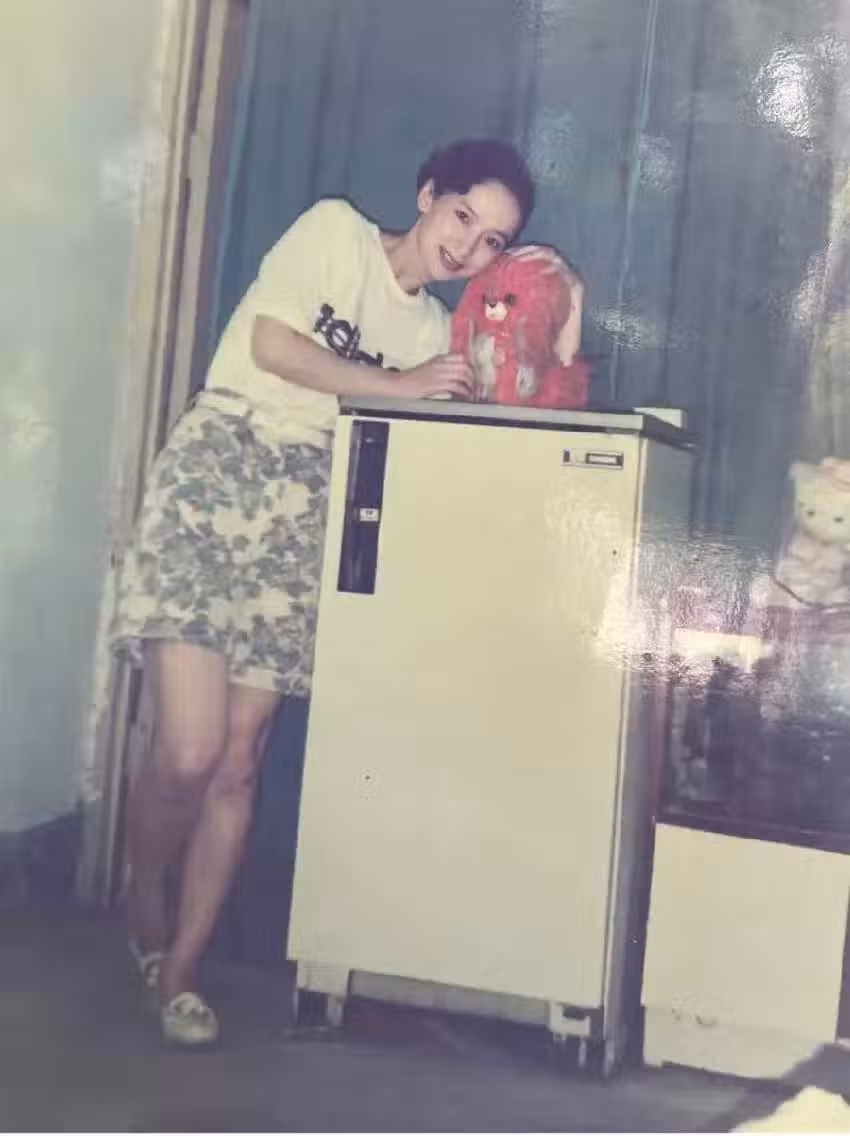 另一張照片中,她穿著花紋短褲和簡單的T恤,站在冰箱旁,俏皮地靠著一隻毛絨玩具,臉上帶著甜美的微笑。