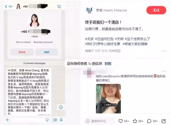 Alice在內容中指稱:「我相信我有幫到『想巷』讓多一些人認識你們,所以你們可以給我一個獎勵的紅包,讓大家高興一下嗎?」