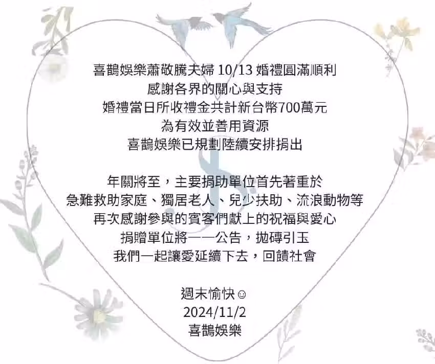做好事的同時,蕭敬騰也甜蜜展現度蜜月的幸福,他們沒有享受兩人世界,反而相邀友人一起前往日本沖繩遊玩,此行竟有20人相隨,但這不滅蕭敬騰婚後熱愛放閃的熱情,大方牽起老婆的手過馬路,一起大啖沖繩美食、打高爾夫球,看煙火時甜蜜依偎,畫面充滿浪漫與歲月靜好。全數捐出真的太暖了,相信能幫很多人過個好年!